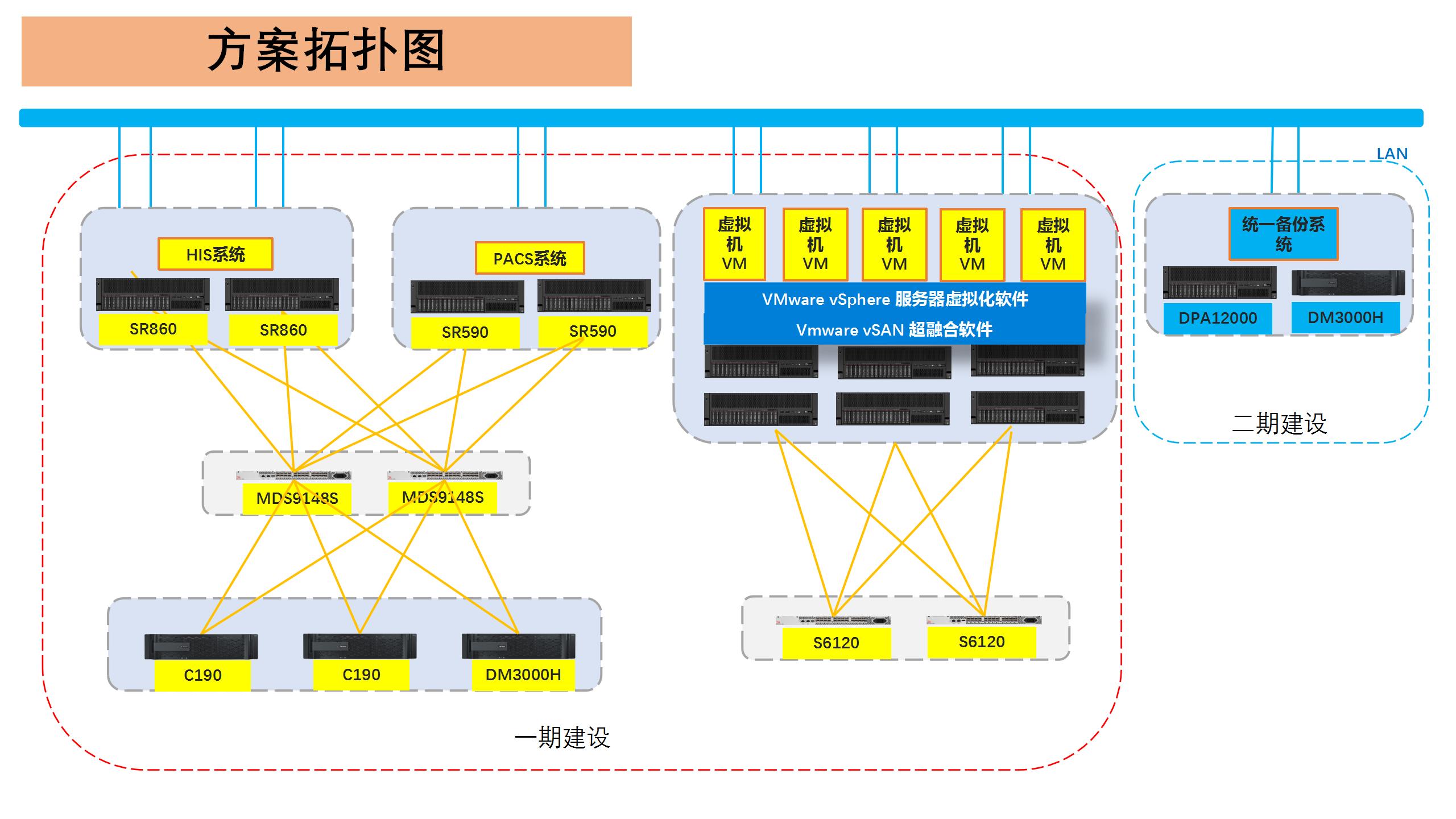 基于吳起縣人民醫(yī)院的實(shí)際需求,在預(yù)算非常有限的情況下,藍(lán)島科技攜手聯(lián)想提供了令用戶滿意的解決方案,方案以聯(lián)想ThinkSystem SR860作為HIS系統(tǒng)服務(wù)器,SR860采用英特爾至強(qiáng)可擴(kuò)展處理器,為HIS系統(tǒng)的運(yùn)行提供了卓越的速度和可靠性;部署2臺(tái)NetApp C190通過SnapMirror-Business Continuity方式實(shí)現(xiàn)存儲(chǔ)級(jí)雙活;部署1臺(tái)DM3000H主要運(yùn)行PACS數(shù)據(jù)庫,未來通過SnapMirror,組成高可用環(huán)境;以6*VX5520構(gòu)建基于vSAN的超融合虛擬化資源池,搭載起吳起縣人民醫(yī)院的其他業(yè)務(wù)系統(tǒng),實(shí)現(xiàn)統(tǒng)一管理,彈性調(diào)度,靈活分配。
