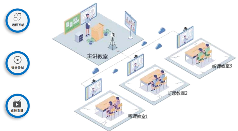 各課室建設錄播主機,實現(xiàn)課堂師生畫面跟蹤,音視頻錄制、在線直播、點播。系統(tǒng)實現(xiàn)在授課過程中,本地教室與遠程聽課教室之間的同步授課,以及實時音視頻互動交流。互動課程能夠同步錄制,真實展現(xiàn)互動教學場景。積極推動“一校帶多點”、“一校帶多校”的教學和教研組織模式,逐步使依托信息技術的“優(yōu)質學校帶薄弱學校、優(yōu)秀教師帶普通教室”模式制度化。